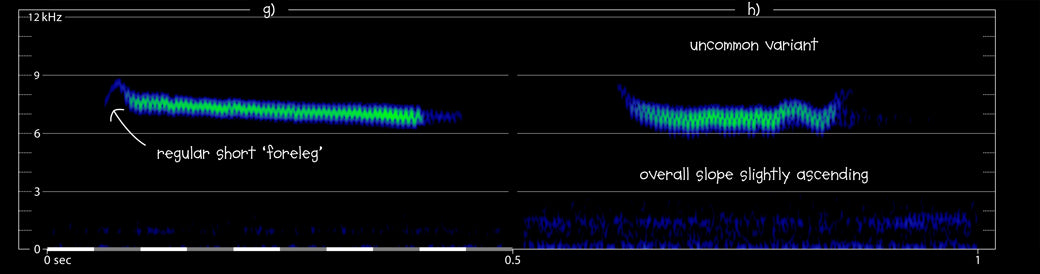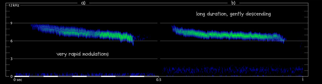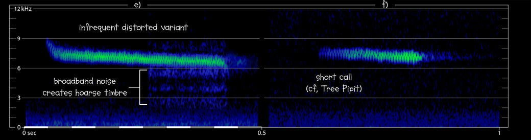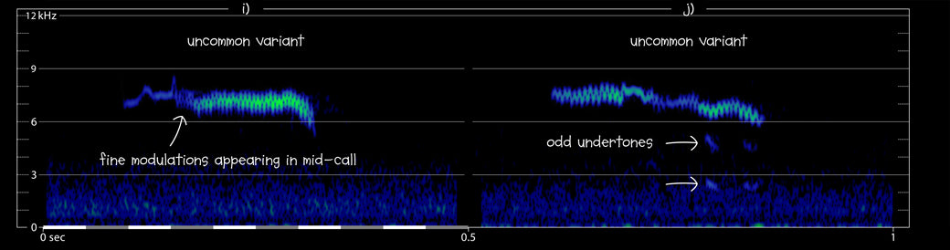 j) Redwing Turdus iliacus Poole, Dorset, England, 01:17, 30 October 2016 (Paul Morton). An NFC with an unusual timbre due to an odd middle part lacking the fine modulations and a clicking undertone that probably belongs to the same individual Redwing. First call shown. Background: Eurasian Skylark Alauda arvensis. 161030.PM.011723.02
