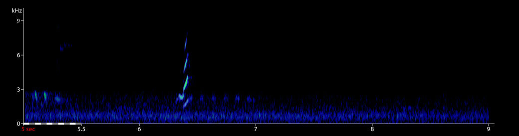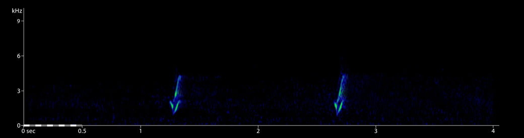 Besh Barmag, Siazan, Azerbaijan, 02:52, 6 May 2005 (BB). Two flight calls of a nocturnal migrant; first call shown. For a zoomed-in version see a) below. Background: Common Nightingale Luscinia megarhynchos and Marsh Frogs Pelophylax ridibundus. 190506.MR.025232.01