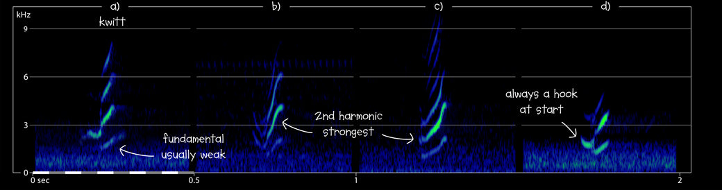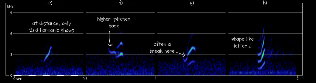 a) Spotted Crake Porzana porzana Besh Barmag, Siyazan, Azerbaijan, 02:52, 6 May 2005 (BB). Two flight calls of a nocturnal migrant; first call shown. For a zoomed-out version see top of page. Background: Common Nightingale Luscinia megarhynchos and Marsh Frogs Pelophylax ridibundus. 190506.MR.025232.01