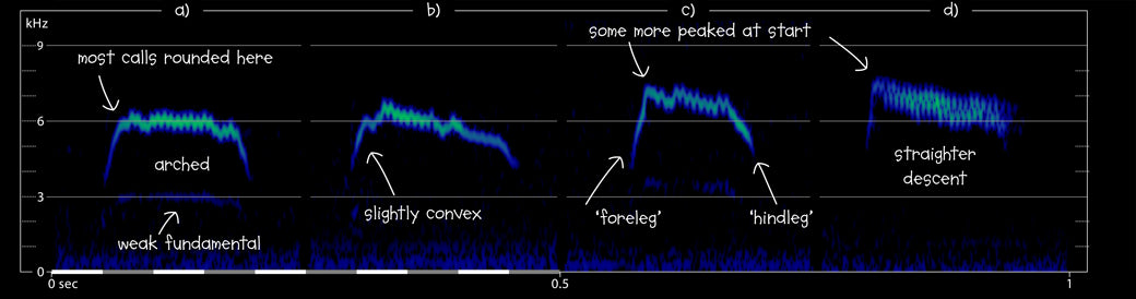 Portland, Dorset, England, 02:05, 21 August 2016 (Nick Hopper). Flight calls of several nocturnal migrants, passing slowly on an overcast night. For two zoomed-in sonagrams from this recording see g) and j).