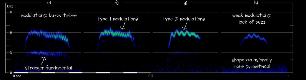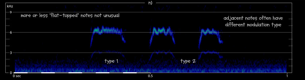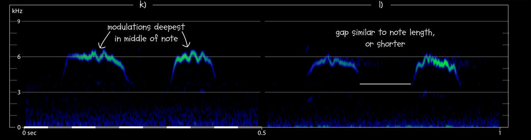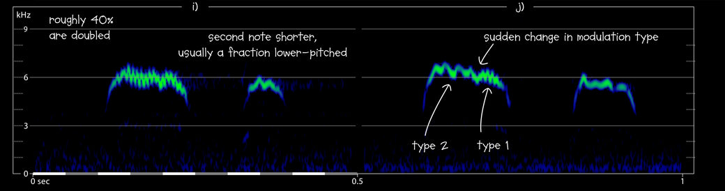 j) Tree Pipit Anthus trivialis Portland, Dorset, England, 02:05, 21 August 2016 (Nick Hopper). Two-note call of a nocturnal migrant, followed by a quieter single-note call. Background: Common Ringed Plover Charadrius hiaticula. For full recording see top of page.