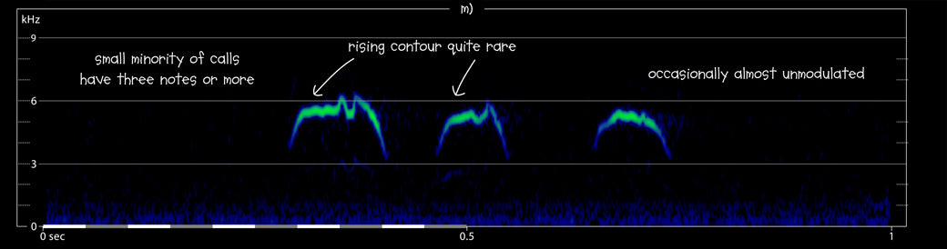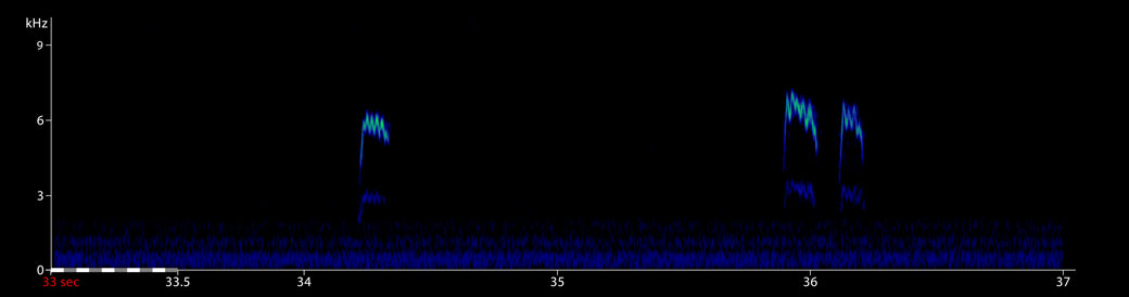 c) Tree Pipit Anthus trivialis Portland, Dorset, England, 23:27, 25 August 2016 (Nick Hopper). Flight calls of at least two nocturnal migrants, mainly single-note but also double-note calls. Sonagram shows first call. Background: foghorn and Great Green Bush-cricket Tettigonia viridissima.