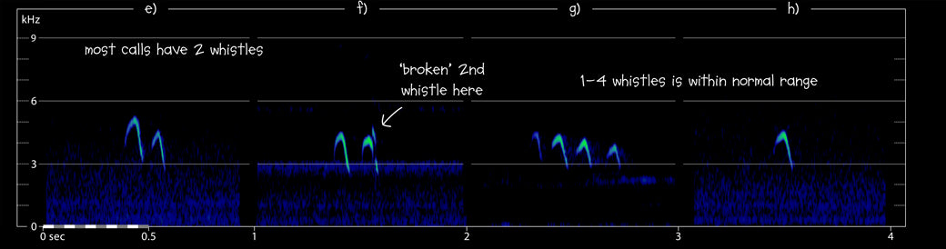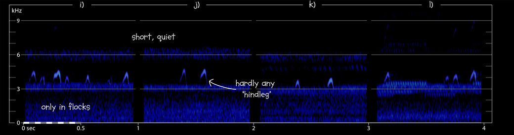 e) Wood Sandpiper Tringa glareola Potsdam, Brandenburg, Germany, 04:56, 12 September 2016 (Lukas Pelikan). Two pi-pe calls of a nocturnal migrant over an urban area; sonagram shows first call. Background: Song Thrush Turdus philomelos.